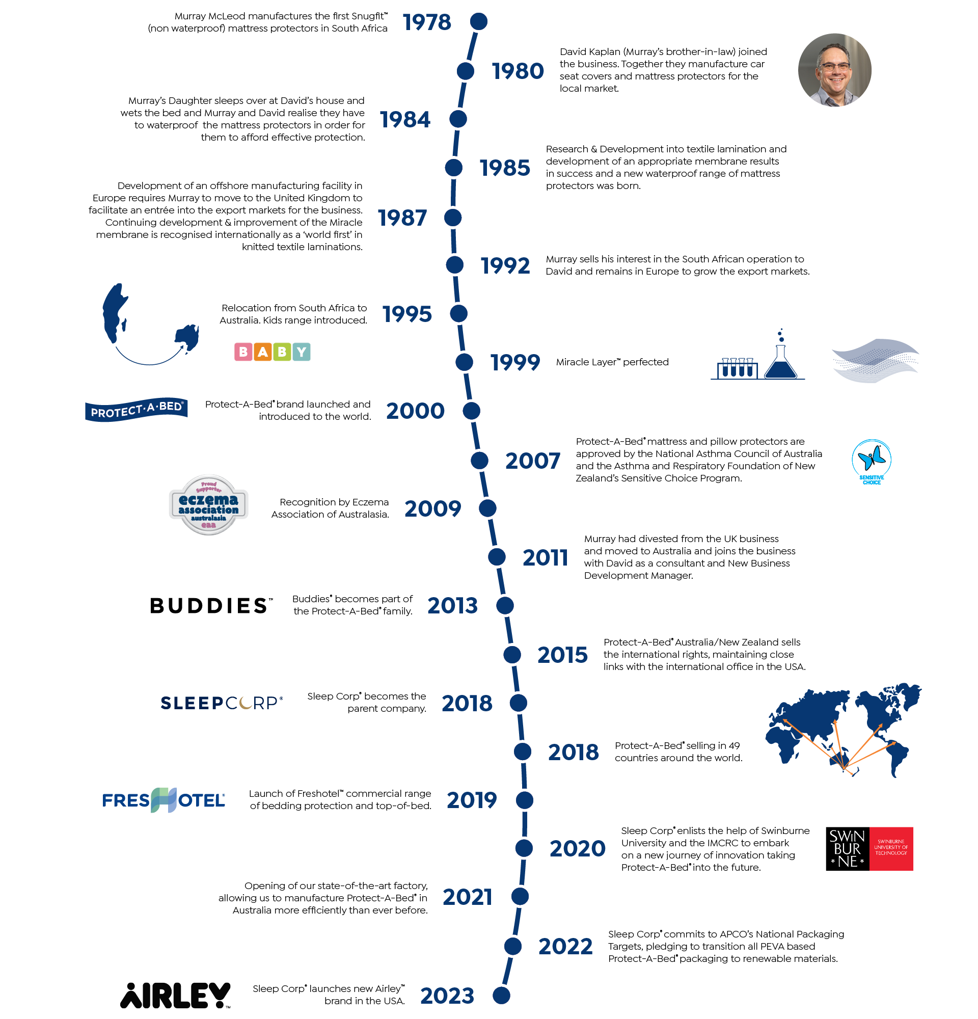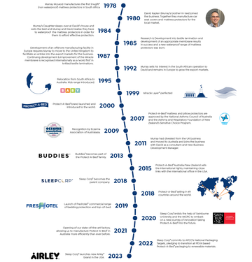 Inspired by a practical need (Murray's daughter's nighttime accident!), the company pioneered the world's first waterproof mattress protector in 1984.